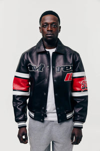 Limitierte Edition: Avirex-Jacke aus 100 % antikem europäischem Lammleder mit Kunstaufnähern aus Chicago, IL und appliziertem Futter. Breite Streifen an den Ärmeln.